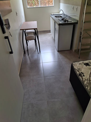 Apto com frigobar, micro-ondas, fogão, cama, mesa com duas cadeiras, painel com TV